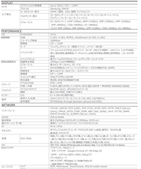 ・最大16ch,1200万画素カメラ対応 ・H.265、H.264,MJPEG対応,WiseStreamサポート ・180Mbpsネットワークカメラ録画 ・16個のPoE/PoE+ポートによるプラグ&プレイ ・最大4HDD、e-SATAストレージ対応 ・HDMI/VGAローカルモニター ・P2Pサービス(QRコードコネクト)対応